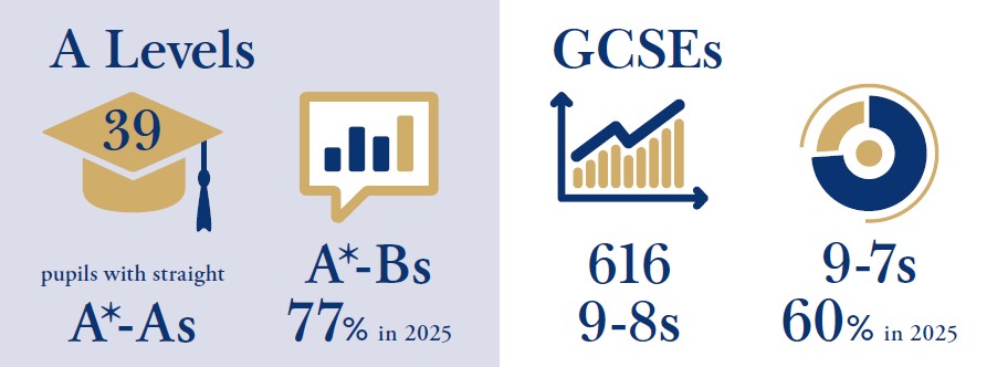 In 2025, 60% of grades were awarded 9-7 at IGCSE. Across all entries, 616 grade 9/8’s were awarded to pupils and our five-year average of 9-8 grades awarded to pupils is 44% and for 9-7 grades is 60%. The majority of pupils progress from Fifth Form to our Sixth Form, where our curriculum is based around A Level qualifications.